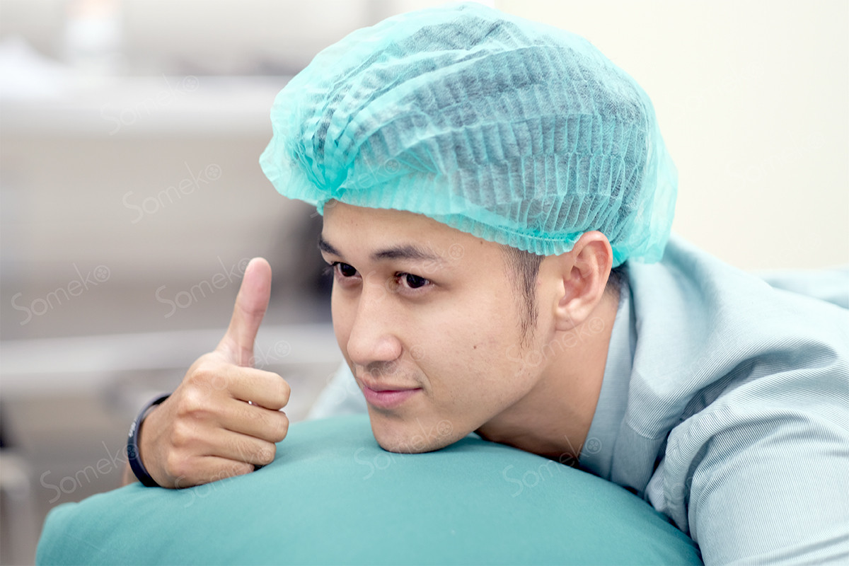 พอได้ยินคำว่าเอาเนื้อที่ก้นกบมาเติมปลายจมูก ยอมรับเลยครับว่าตกใจ รีบถามคุณหมอมิวกลับว่าเจ็บมากไหม คุณหมอมิวบอกว่าไม่เจ็บเลยเพราะหมอมิวฉีดยาชาให้ เปิดแผลเล็กนิดเดียว หลังทำนั่งนอนได้สบายตามปกติ อาจมีตึงๆบ้างในวันแรกๆไม่ต้องกังวล แต่ก้นกบจะช่วยทำให้ปลายจมูกที่งุ้มลงดูเชิดและพุ่งขึ้นได้ นอกจากนี้ยังช่วยป้องกันการทะลุได้ด้วย ผมเลยโอเคตกลงตามที่คุณหมอมิวแนะนำเลยครับ ถึงเวลาเข้าห้องผ่าตัดแล้วครับ ก่อนจะเสริมจมูก ผมต้องนอนคว่ำก่อนเพื่อเอาเนื้อก้นกบออกมา ก็ตามคุณหมอมิวบอกครับว่าไม่เจ็บ แต่จะรู้สึกตึงๆ
