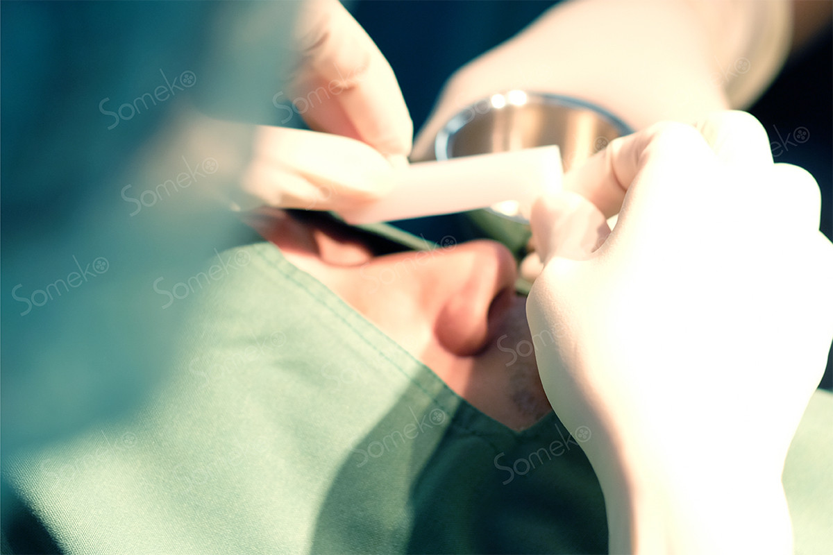 หลังจากได้เนื้อก้นกบแล้ว ก็จะลงมือฉีดยาชาและเปิดแผลทีจมูก ตามด้วยการตะไบฮัมพ์ ในช่วงที่ตะไบจะได้ยินเหมือนเสียงครืดๆ ก็จะเสียวๆครับ หลังจากนั้นคุณหมอมิวจะทำการวัดซิลิโคนกับจมูกและค่อยๆเหลาซิลิโคนให้พอดีกับจมูกของผม ที่นี่คุณหมอมิวจะเหลาซิลิโคนเองกับมือทุกเคสเลยครับ ไม่ได้ใช้ซิลิโคนสำเร็จรูป ทำให้ซิลิโคนที่ได้มีความเฉพาะกับใบหน้าของทุกคนที่เข้ามาทำจริงๆ หลังจากคุณหมอมิวเหลาซิลิโคนจนได้ทรงที่น่าจะพอดีแล้วก็จะลองใส่ซิลิโคนเข้าไปในจมูกและปรับใหม่จนกว่าจะพอดีเป๊ะกับจมูกผม แล้วถึงจะทำการเย็บแผลครับ ตอนที่เสริมจมูกเสร็จทันทีก่อนจะแปะเฝือกอ่อนก็เห็นความแตกต่างเลยครับว่าปลายจมูกที่เคยงุ้มลงพุ่งเชิดขึ้นครับ